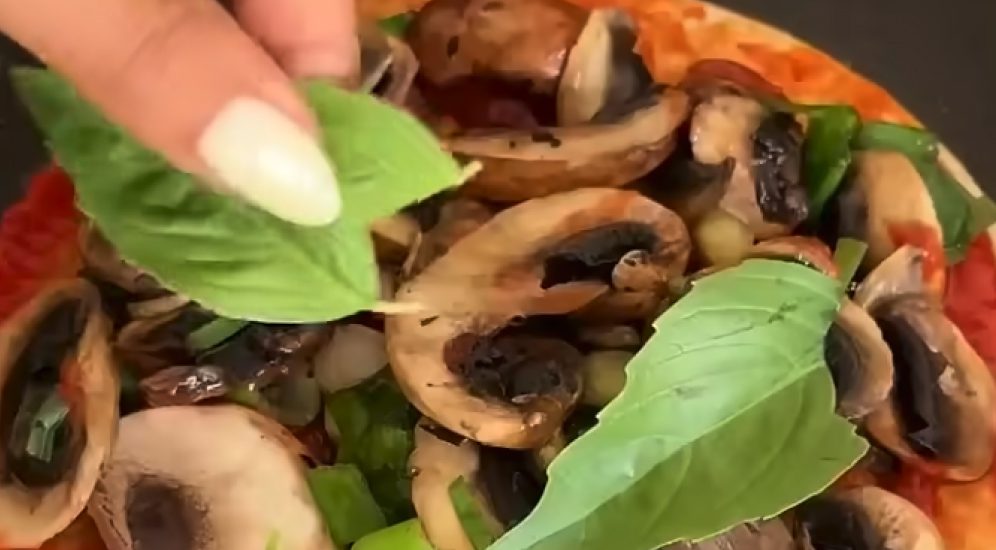 3. מתחילים להרכיב את הפיצה על המחבת – מורחים כ2 כפות רוטב עגבניות 4. מניחים מעל את התערובת פטריות, מוסיפים בזיליקום ומומלץ להוסיף מעל.