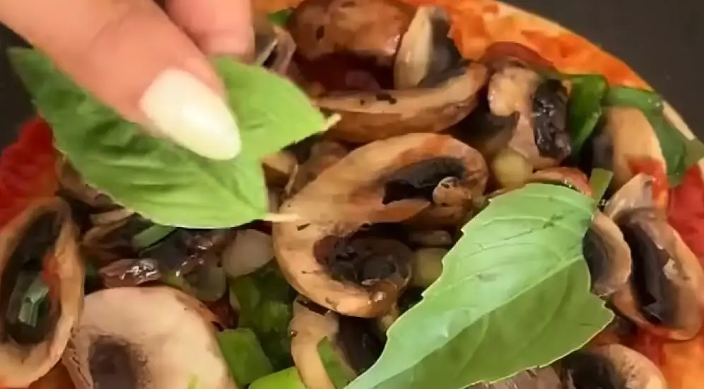 3. מתחילים להרכיב את הפיצה על המחבת – מורחים כ2 כפות רוטב עגבניות 4. מניחים מעל את התערובת פטריות, מוסיפים בזיליקום ומומלץ להוסיף מעל.