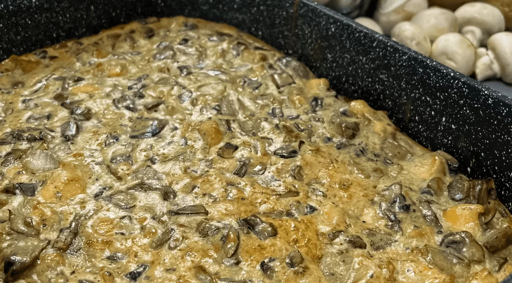 - לאחר שהתקררו המרכיבים, מוסיפים לפטריות והעוף, את הביצים, הקמח, משפר האפייה, ומערבבים היטב.