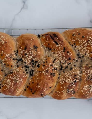 - להניח את המאפה בצד לכמה דק׳, ואז לפרוס לעיגולים בעובי של כ-2 ס״מ ולהניח אותם עם הפנים כלפי מעלה. להבריש שוב עם ביצה ולפזר שומשום מעל.
