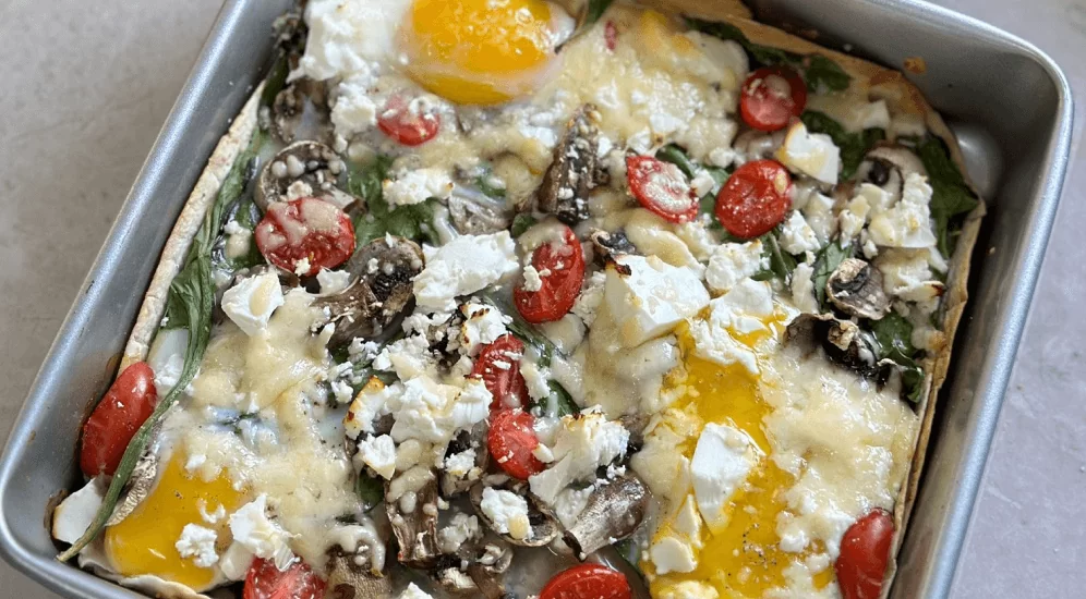 - שמים עלי טורטייה בתחתית התבנית, מפזרים מעל כל המצרכים.
