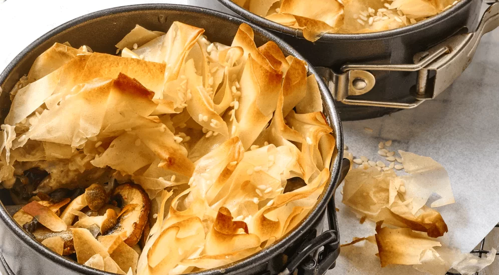 - מרפדים את התבנית אפיה ב-4 עלי פילו מוברשים בשמן זית, גדולים מעט מגודל התבנית, כך שיעלו מעט על הדפנות.