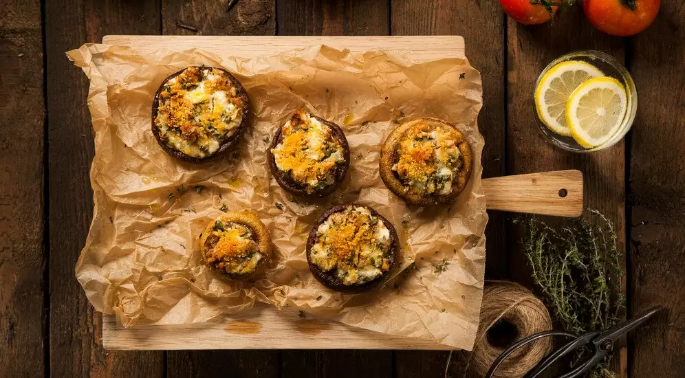 פטריות פורטבלה במילוי גבינת עיזים, פרמזן, אגוזים ועשבי תיבול עם פירורי לחם זהובים מעל – NO.35