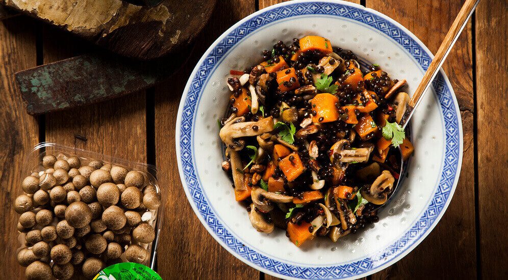 סלט עדשים שחורות עם קוביות בטטה ופטריות צרובות ברוטב מייפל וצ'ילי – NO.5