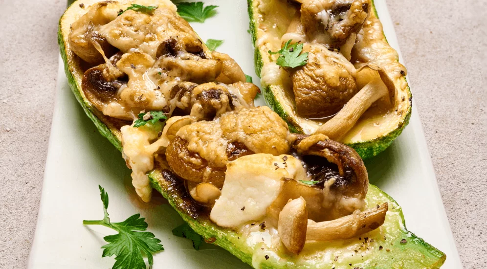 - ממלאים את הסירות בתערובת הפטריות, חתיכות של גבינת עיזים ופרמזן מגורר ומעט פרורי לחם למעלה.