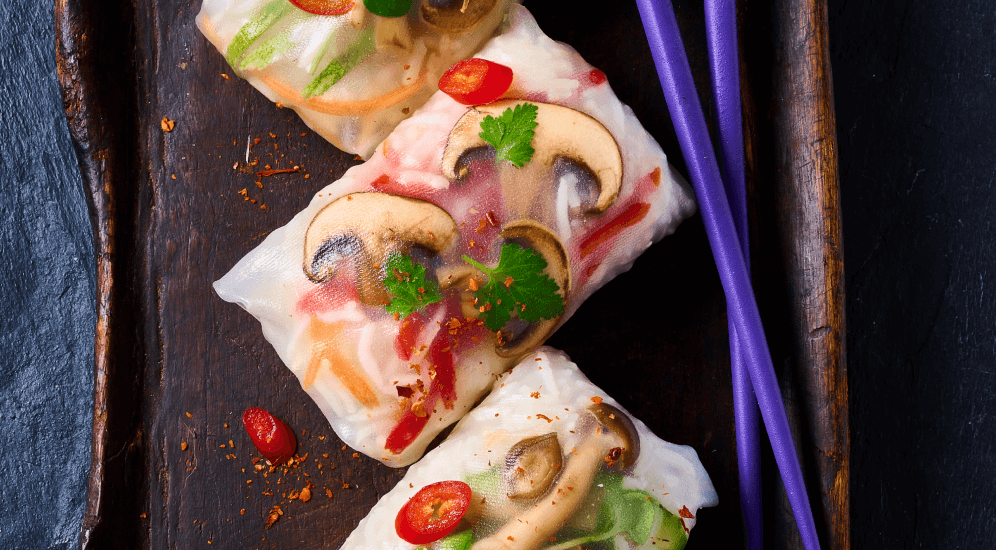 - ממלאים את עלי האורז בפטריות צרובות, אורז וירקות לפי הטעם האישי ומגלגלים למעטפה